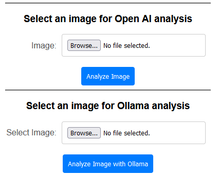 To make the experiment easier and more interactive, I developed a small prototype with a simple user interface. The prototype allows you to select an image and ask the models to analyze it based on a given prompt. Below is a snapshot of the UI I created for this experiment.