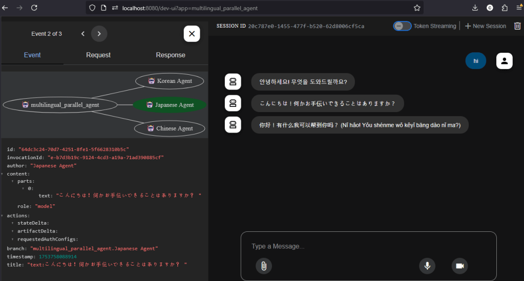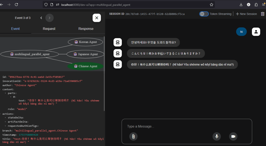 Chinese. The Dev Web UI provided helpful visibility into each agent’s