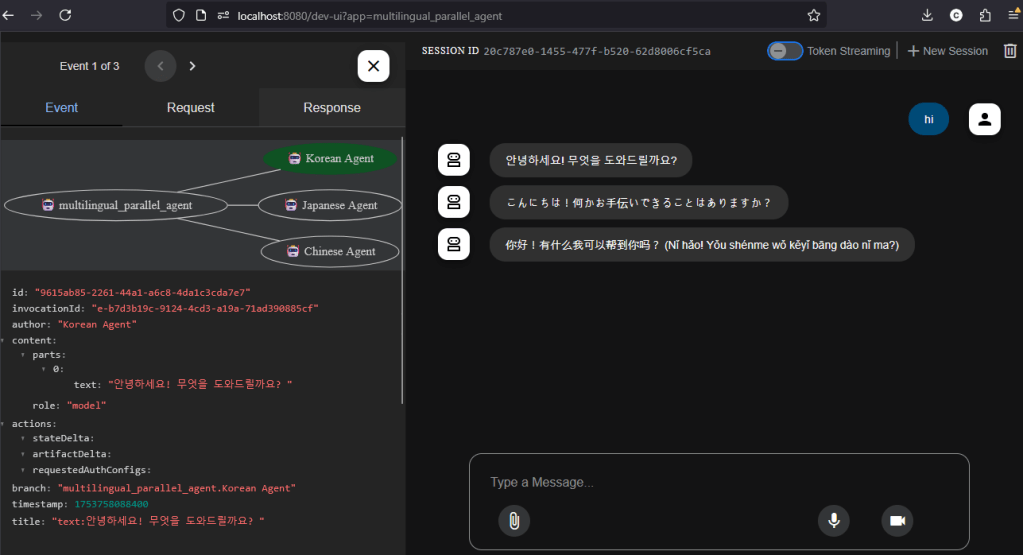 the MultiLingualParallelAgent responded in Korean, Japanese, and